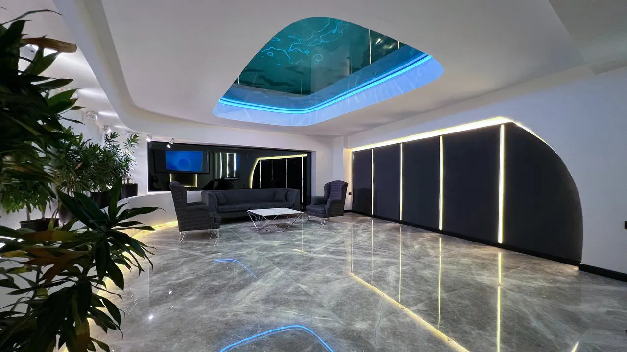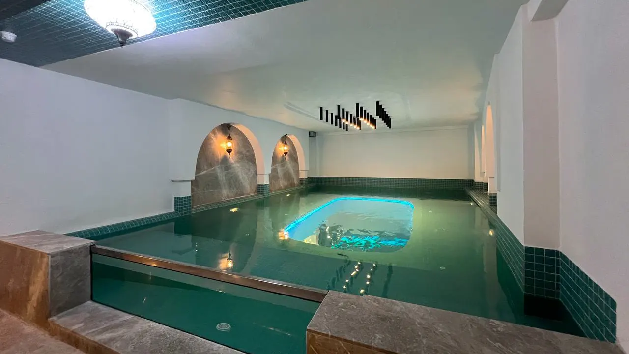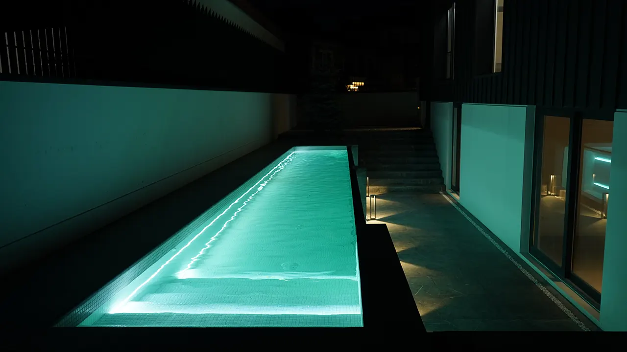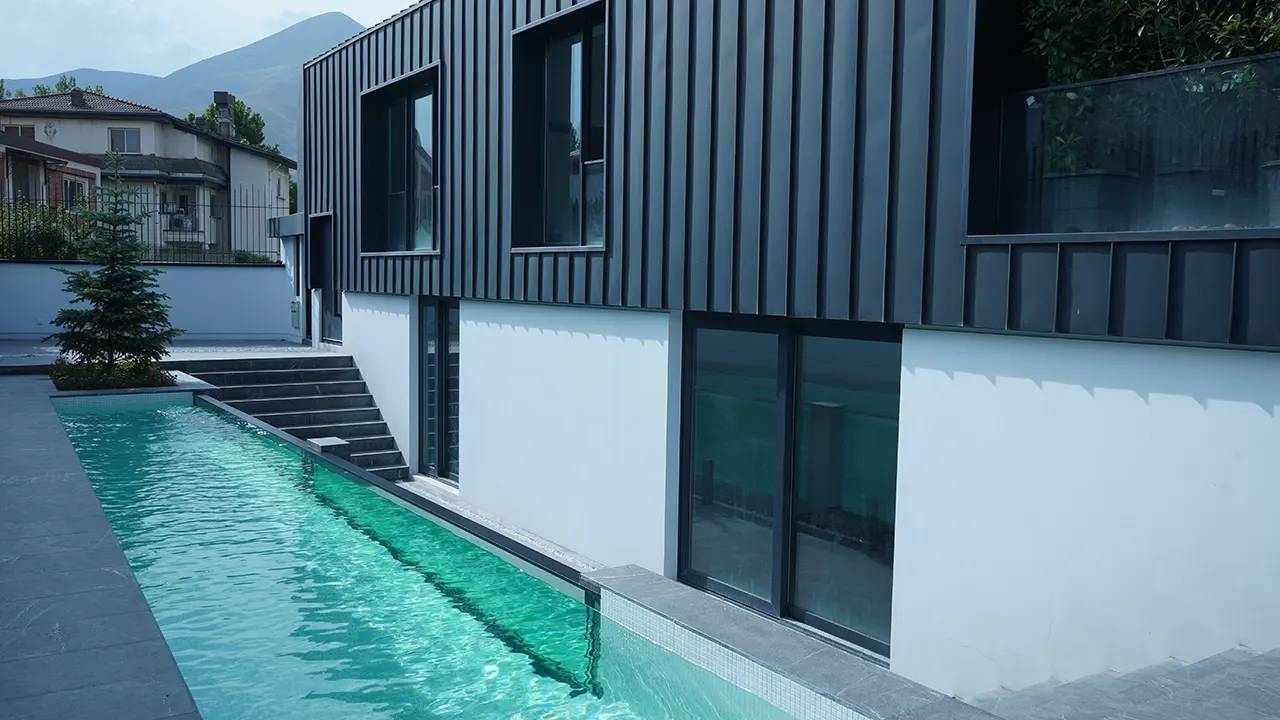 دو وجه شیشه‌ای در طول استخر، ترکیبی از سادگی و کارایی است، که نور، آب و فضا را در هماهنگی کامل قرار داده و شکوه معماری مدرن را به نمایش گذاشته است.
